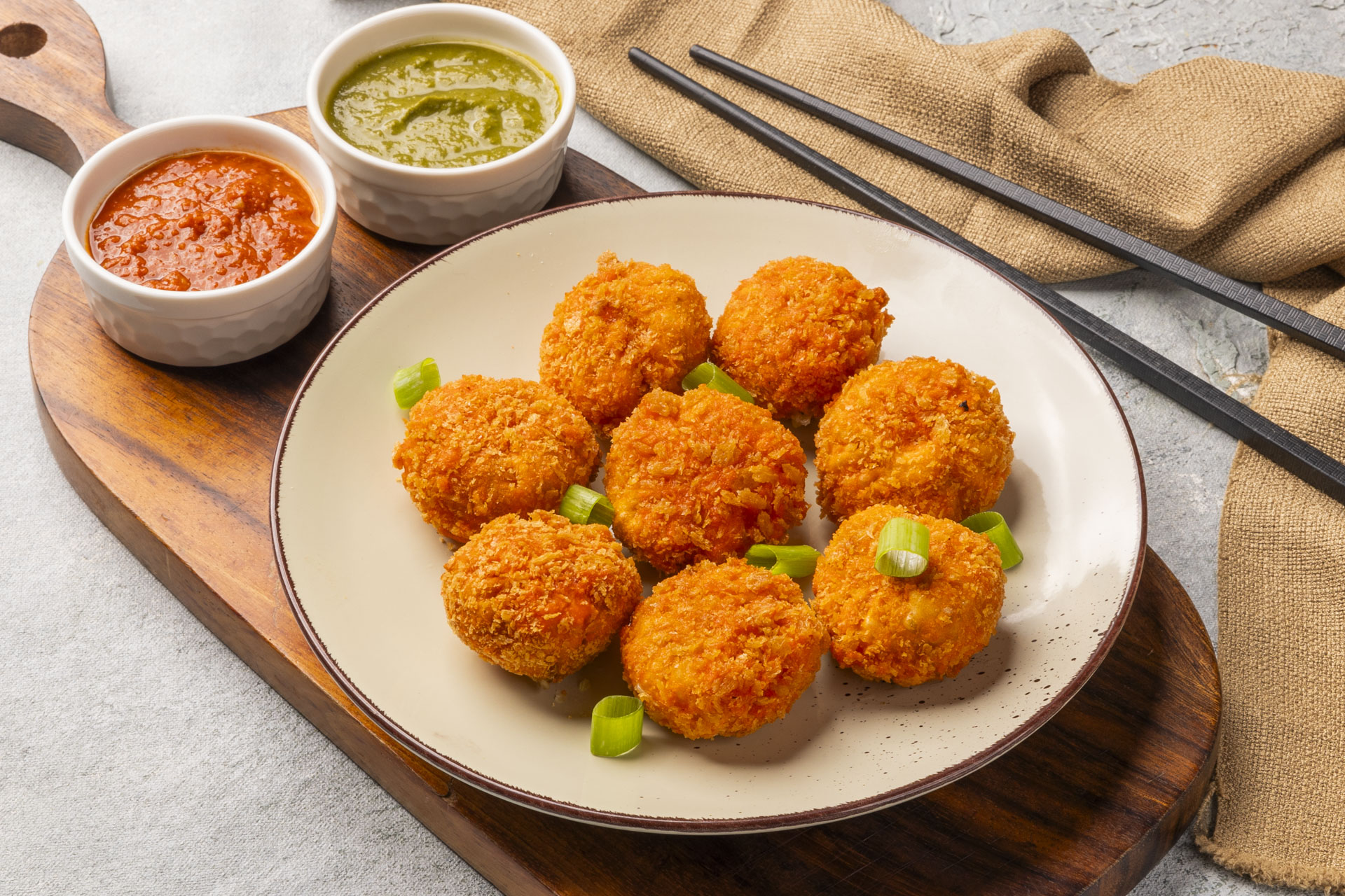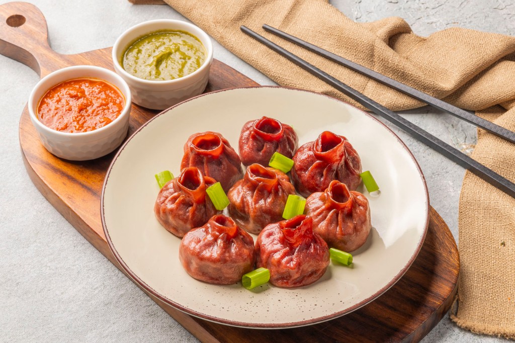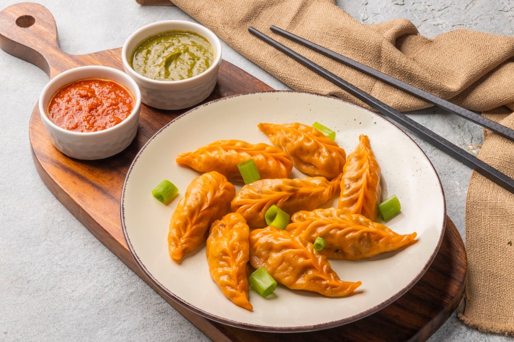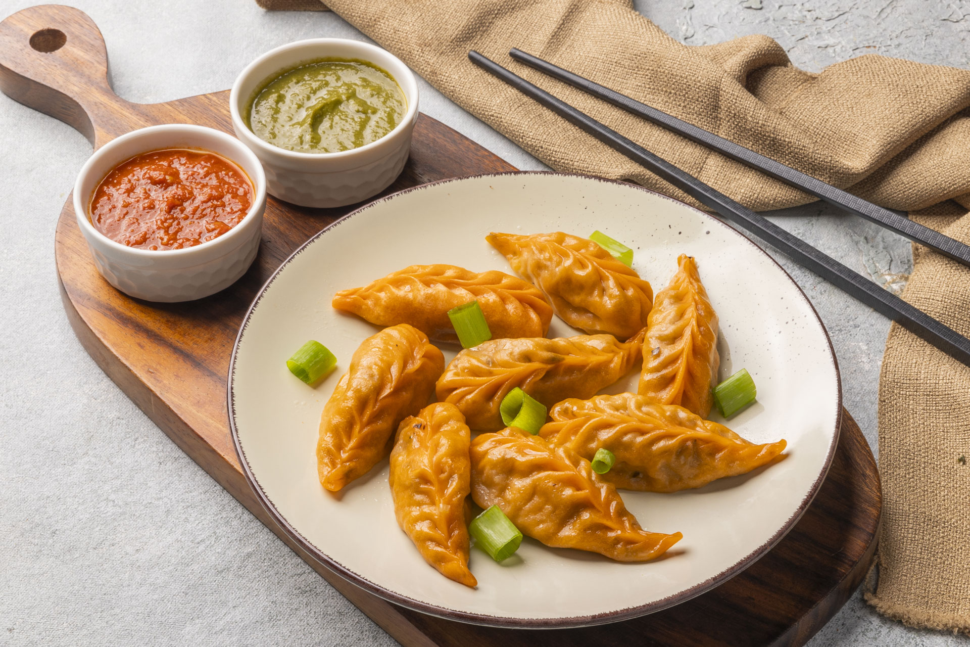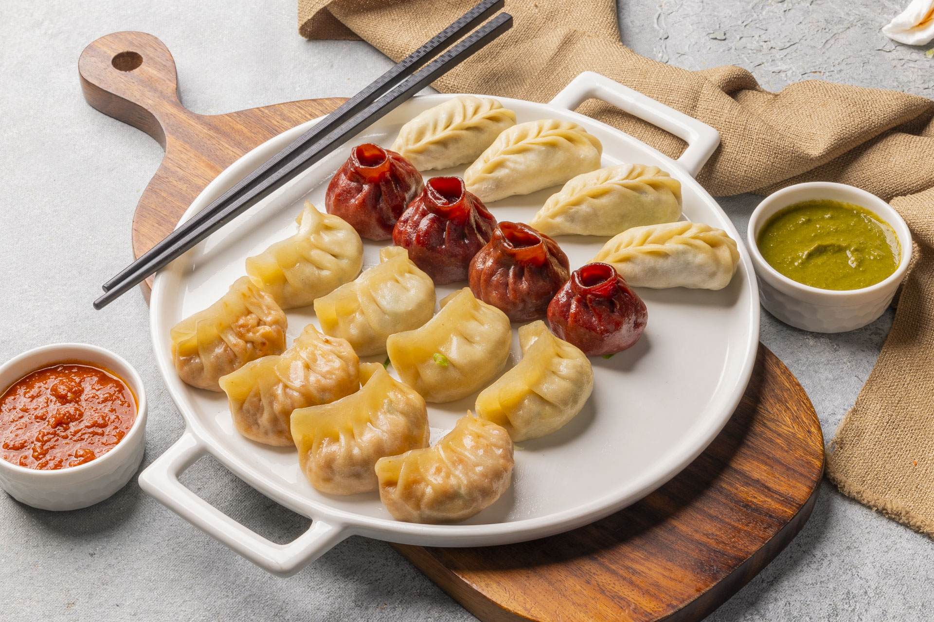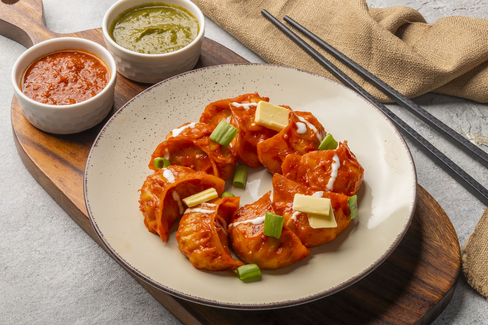 A mouthwatering non-veg momos platter featuring juicy chicken momos with a perfect mix of steamed, fried, and tandoori momos, crafted in authentic Delhi street-style. Packed with rich flavors and smoky aroma, these delicious chicken dumplings are served hot with spicy red chutney and refreshing green chutney. A must-try for anyone searching for the best momos near me, this platter delivers the ultimate Indian street food experience — perfect for snacks, dinner, or sharing with friends. 😋🔥